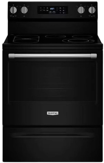 Sturdy door hinges on this Maytag® electric range are built for dependability, while the fingerprint resistant stainless finish and ceramic glass cooktop help make cleaning easy.