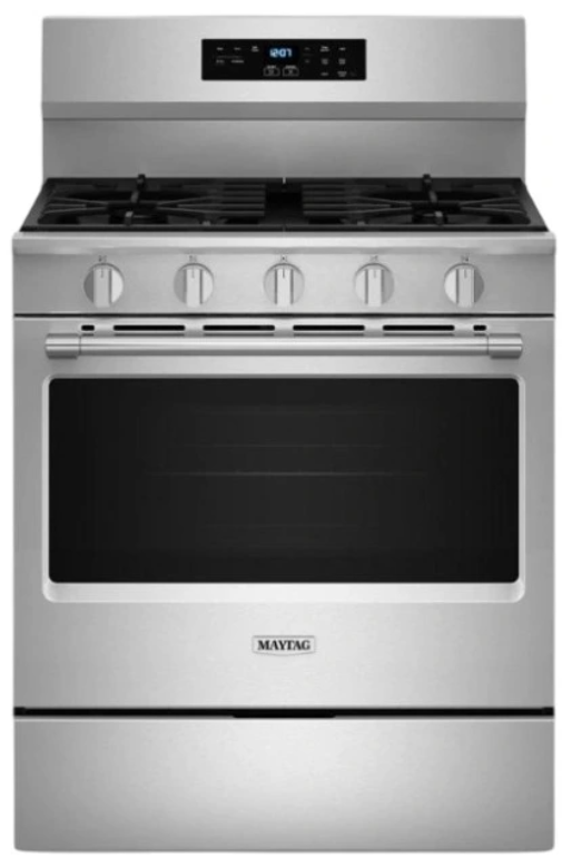 Maytag® 30" Fingerprint Resistant Stainless Steel Freestanding Gas Range features No Preheat Air Fry, Power™ Burner, High Temp Self Clean, Precision Cooking™ System, Edge-to-Edge Dishwasher-Safe Cast Iron Grates, Simmer Burner, and Air Powered Convection.Read More